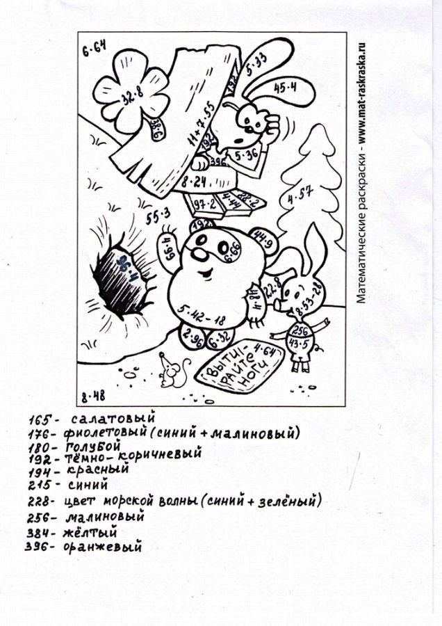 Понравились математические раскраски? Предлагаем Вам посмотреть раскраски по русскому языку и другим предметам: https://www.mat-raskraska.ru/products